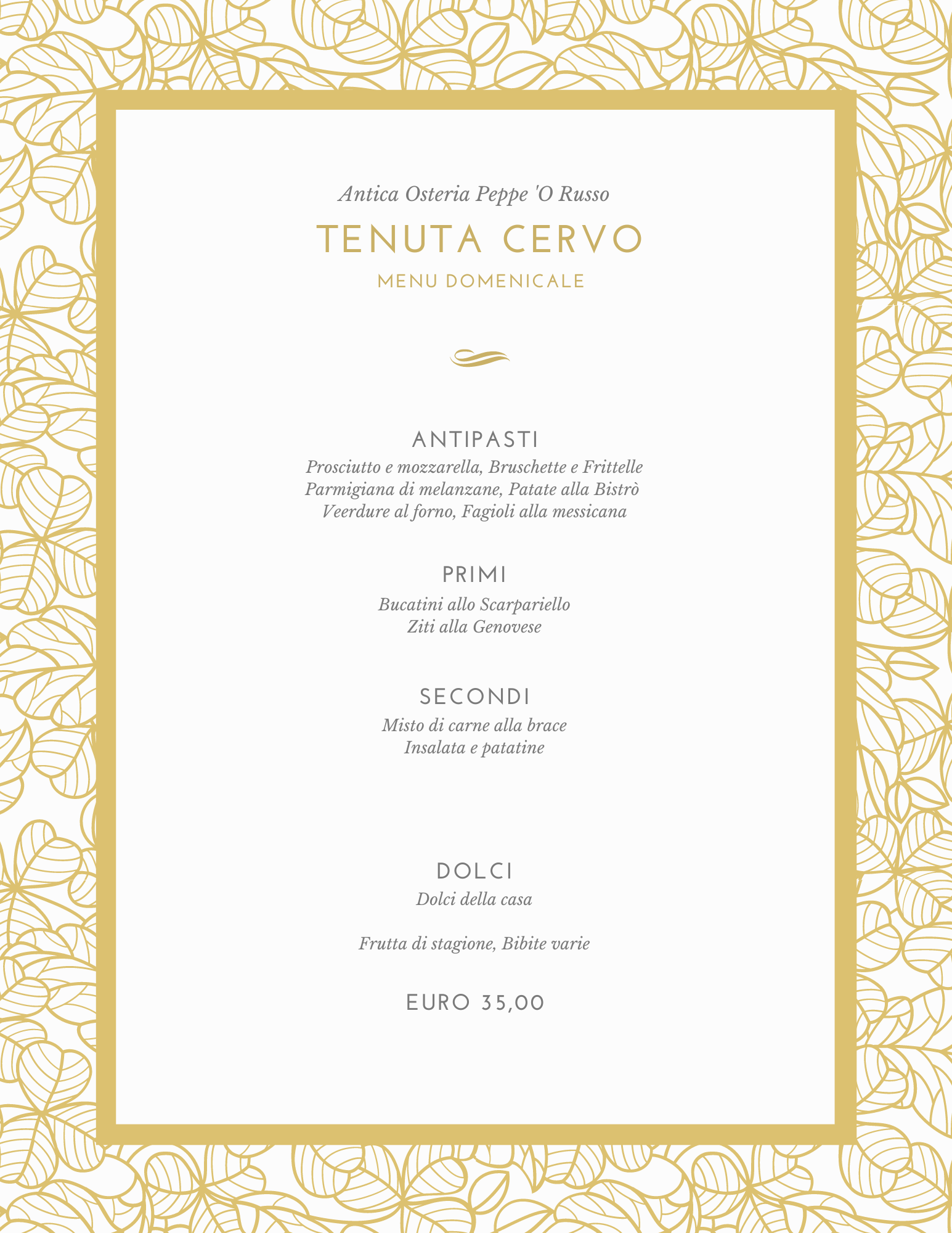 Presso il ristorante tipico campano Tenuta Cervo Antica Osteria Peppe 'O Russo è possibile gustare i migliori piatti della tradizione regionale, eredità di una cultura culinaria secolare. Terra conosciuta nel mondo per la sua ricchezza di prodotti sani e genuini, la Campania è da sempre associata all'idea del buon cibo e dell'attenzione al gusto e alla freschezza dei prodotti: proprio nel rispetto di quest'antica filosofia, il ristorante della Tenuta Cervo propone ogni giorno piatti preparati con ingredienti selezionati, che spaziano dai primi, sia di terra che di mare, a secondi come il baccalà o la braciola di cotica di maiale, passando per i carciofi arrostiti sui carboni ardenti e le frittelle calde passate nello zucchero con cioccolato fuso.