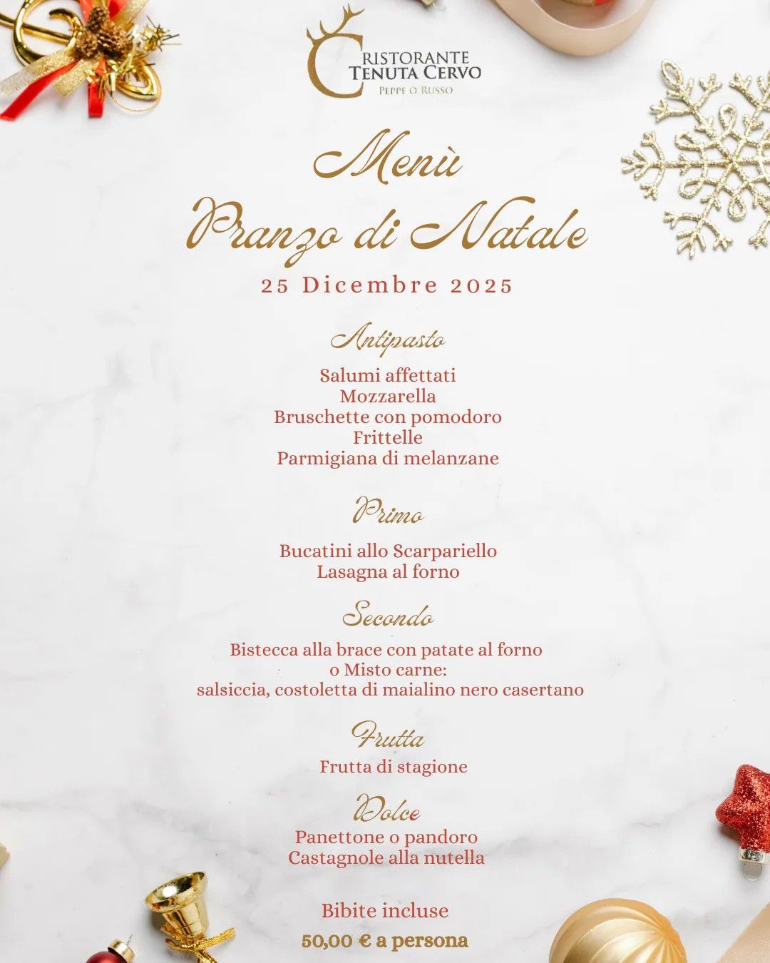Il Ristorante Tenuta Cervo ti invita a vivere le festività natalizie con quattro appuntamenti speciali, pensati per celebrare insieme i sapori autentici della cucina campana. Dall’atmosfera calda del pranzo di Natale alla magia della cena di San Silvestro, ogni menu è un viaggio tra piatti della tradizione e tocchi di creatività.